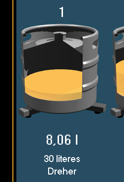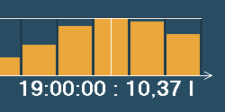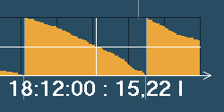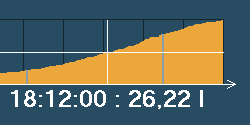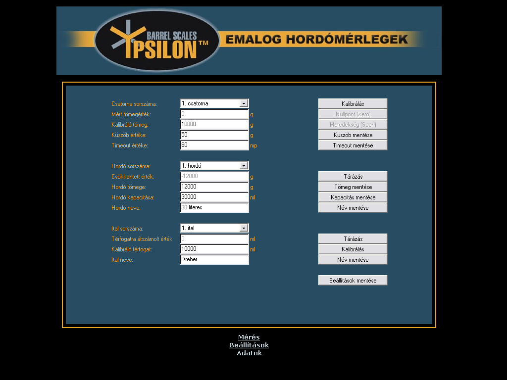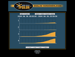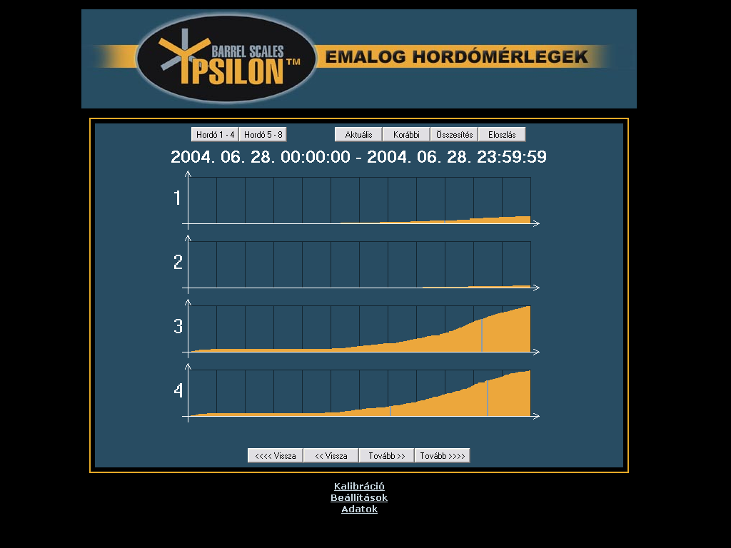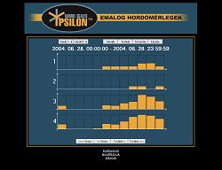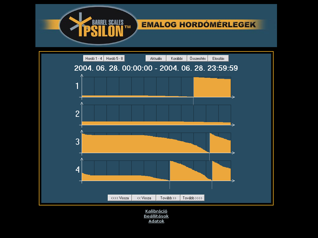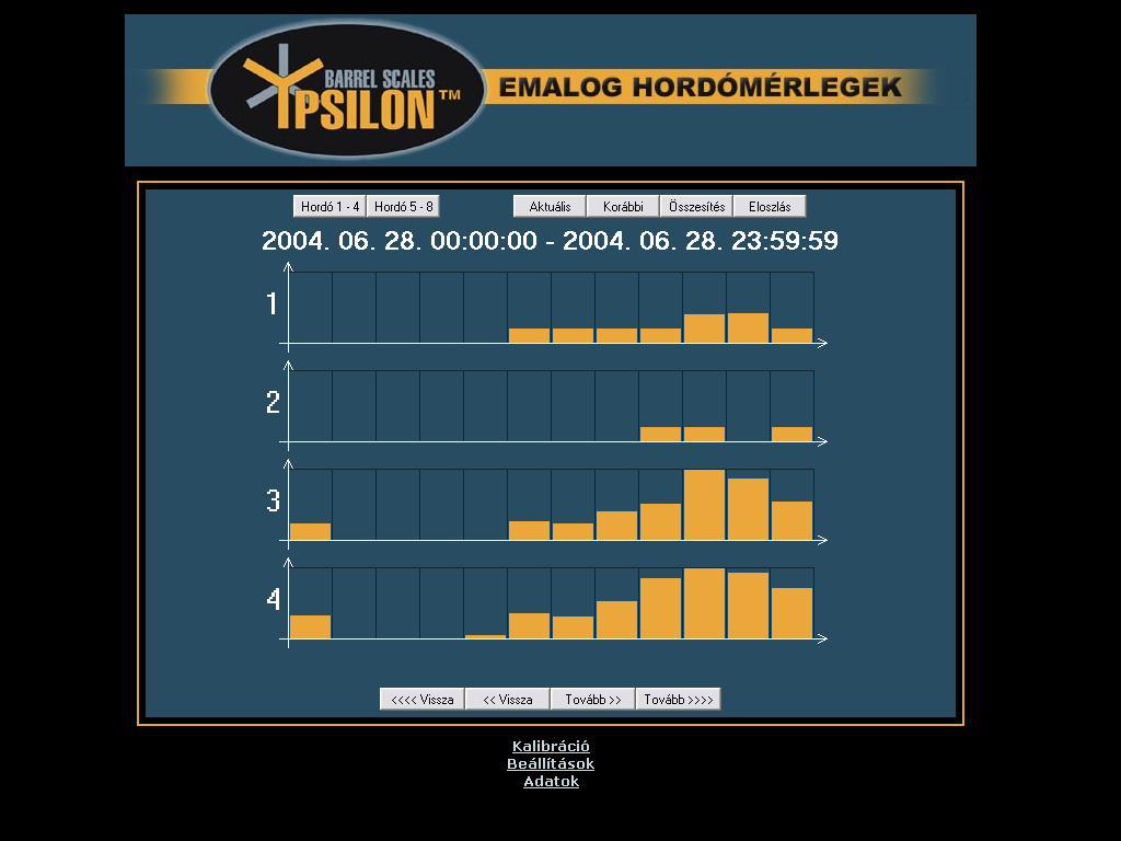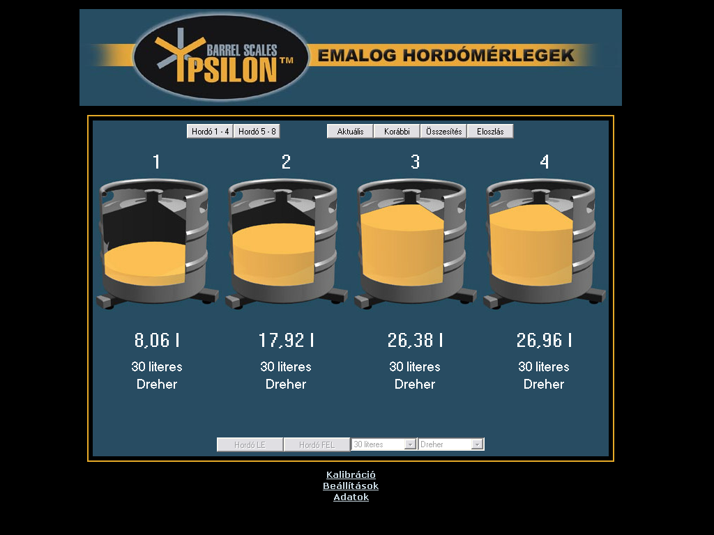 | Adatgyűjtés az Ypsilon hordómérleggel Az Ypsilon hordómérleg kezelőfelülete egy html oldalba ágyazott Java program, mely állandó kapcsolatban áll a mérleggel és az adatrögzítő eszközzel. A kezelőfelület elrendezése a jobb oldali képen látható (nagyításhoz kattintson a képre). |  | Az Ypsilon hordómérleg nyolc hordó tartalmát képes nyomon követni. Ebből egyidejűleg négy hordót tud megjeleníteni az ablak középső részében. A bal felső sarokban található nyomógombok segítségével választhat az első négy és a másik négy hordó megjelenítése közül. |  | A szoftver a hordók tartalmát animált képek segítségével ábrázolja, és tíz százalékos lépésekben követi az ital fogyását a tele hordótól kezdve egészen az üresig. A program a hordó képe alatt a mért mennyiséget számszerűen is megjeleníti 0,01 liter pontossággal, a hordó és a benne tárolt ital nevével együtt. |  | Teendők üres hordó cseréje esetén Ha egy hordó kiürül, akkor ki kell cserélni. Az adatgyűjtés megfelelő működésének érdekében a cserét a programban is regisztrálni kell. Első lépésben válassza ki a cserélni kívánt hordót, és kattintson rá az egérrel. A kiválasztott hordó körül vékony keret jelenik meg. |  | Az ablak alsó részén aktiválódik a "Hordó LE" feliratú nyomógomb. |  | A gombra kattintva a program regisztrálja a hordó levételét. A képről a hordó eltűnik, és csak az üres mérleg lesz látható. Ezután az üres hordó biztonságosan eltávolítható és kicserélhető egy új, teletöltött hordóra. A mérés és adatgyűjtés a többi hordónál természetesen zavartalanul működik tovább. A csere ideje alatt a felhasználó szabadon váltogathat az első négy vagy a második négy hordó megjelenítése között, sőt, az előbbiekben ismertetett eljárás segítségével újabb hordókat távolíthat el. |  | Miután az új, teletöltött hordót feltette, ezt a műveletet is regisztrálnia kell. Ehhez első lépésként válassza ki az egér segítségével a hordóhoz tartozó mérleget (ha a mérleg már ki van választva, akkor erre nincs szükség). Az ablak alsó részén most több vezérlőelem is aktivizálódik, köztük a "Hordó FEL" feliratú nyomógomb. |  | A gombra kattintva a program regisztrálja az új hordó felhelyezését. Néha előfordulhat, hogy a mérlegre más méretű hordót tesznek fel, mint amit levettek, vagy másféle italt szeretnének mérni, mint korábban. Ebben az esetben a gomb megnyomása előtt a gomb mellett található két listából ki kell választani az új hordó és az új ital nevét. |  | A korábban rögzített adatok megtekintése A program segítségével a korábban rögzített adatokat diagramos formában, háromféle nézetben jelenítheti meg. A nézetek közül a jobb felső sarokban található három gomb segítségével választhat. A negyedik, "Aktuális" feliratú nyomógomb segítségével térhet vissza a mérési üzemmódba. |  | Az előzőekhez hasonlóan a program most is négy csatorna grafikonját jeleníti meg egyszerre, a másik négy csatornát a bal felső sarokban található, korábban már említett nyomógombok segítségével tekintheti meg. |  | A grafikon egy előre megadott időszak adatait tartalmazza (a példában ez 24 óra). Az ablak alsó részén található gombok segítségével ugrálhat az időben előre illetve hátra. Az aktuális időszak az ablak felső részén látható. |  | Az adatok letöltése néhány másodpercet vesz igénybe, ezalatt az ablak középső részén a képen látható figyelmeztető üzenet jelenik meg. Ha a program a kért adatokat nem tudja letölteni (például azért, mert egy jövőbeni időpontot választott, melyhez értelemszerűen nem tartozhat még adat), akkor az ablak közepén a "Nincs megjeleníthető adat" felirat látható. |  | A "Korábbi" nézetet választva a program az adott időszakban mért italmennyiséget jeleníti meg, ilyenkor a grafikonok a jobb oldali képen látható alakot öltik (nagyításhoz kattintson a képre). Az ábrán jól látható a hordók tartalmának folyamatos csökkenése, valamint a hordócserék időpontja, hiszen ilyenkor a grafikonon hirtelen növekedés tapasztalható. |  | Ha az egeret a grafikon fölött mozgatja, akkor a program megjeleníti a kurzor alatti időpontot és az ahhoz tartozó értéket. A sárga színnel jelölt adatok a csapolásra vonatkoznak, tehát csak csökkenhetnek. A szürke színű adatok a hordó levételét jelzik, ilyenkor szabálytalan változások, ugrások és negatív értékek is előfordulhatnak. |  | Az "Összesítés" nézetet választva a program az adott időszakban fogyasztott összes italmennyiséget jeleníti meg, ilyenkor a grafikonok a jobb oldali képen látható alakot veszik fel (nagyításhoz kattintson a képre). Az ábrán jól látható az egyes italfajtákból eladott mennyiség folyamatos növekedése, valamint az italok egymáshoz képesti népszerűsége. |  | Ha az egeret a grafikon fölött mozgatja, akkor a program megjeleníti a kurzor alatti időpontot és az ahhoz tartozó értéket. A sárga színnel jelölt adatok a csapolásra vonatkoznak, tehát csak növekedhetnek. A szürke színű adatok a hordó levételét jelzik, ilyenkor a fogyasztott mennyiség nem változik. |  | Az "Eloszlás" nézetet választva a program az adott időszakot kisebb részekre bontja (a példában 2 óránként), és a rész-időszakokban fogyasztott összes italmennyiséget jeleníti meg, ilyenkor a grafikonok a jobb oldali képen látható alakot veszik fel (nagyításhoz kattintson a képre). Az ábrán jól látható, hogy a példában szereplő üzlet éjszaka zárva van, ilyenkor nincs forgalom, és a fogyasztás az esti órákban tetőzik. |  | Ha az egeret a grafikon fölött mozgatja, akkor a program megjeleníti a kurzor alatti időpontot és az ahhoz tart